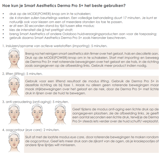• 4 modi voor huidverbetering: insluizen van werkstoffen, lifting, anti-aging en oogcontour;
