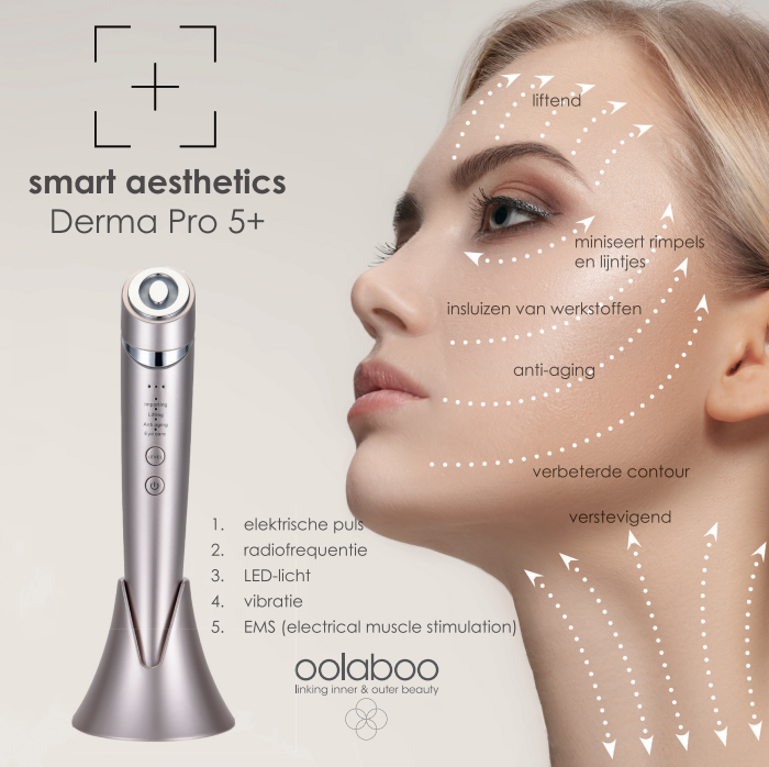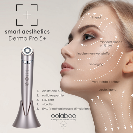 De SMART Aesthetics Derma Pro 5+ is een apparaat voor huidverbetering, dat speciaal is ontwikkeld voor huidverzorging thuis. Het kan door mensen van alle leeftijden en huidcondities worden gebruikt omdat het geen contra-indicaties geeft. Het kan worden gebruikt voor een gezichtsmassage, het verminderen van rimpels, het verstevigen van de huid en het verbeteren van de huidconditie.
